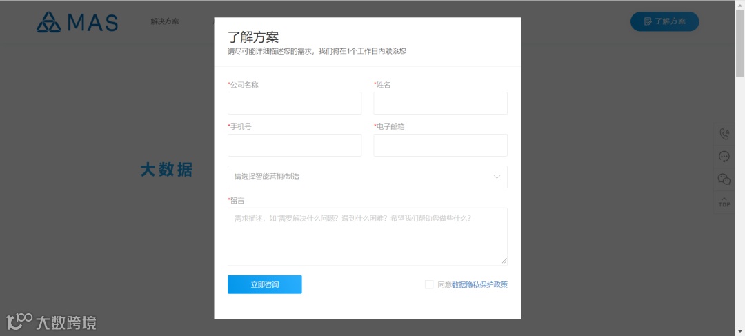 无论您在哪个页面浏览,都可以在右上角找到“了解方案”,轻松点击就可以进入留言板块,将您的难点和问题与我们沟通,数策专家将在第一时间相应您的需求,并与您联系。