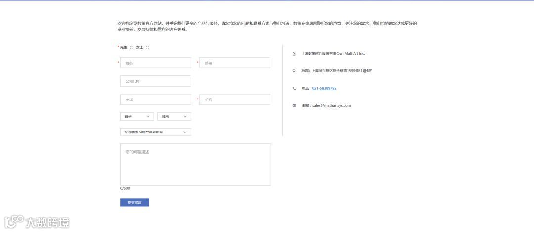 为了更好地与用户互动,此次数策官网新增“联系我们”的垂询功能,用户可以在线提交所关注的产品服务或者其他意见反馈,数策将第一时间收集和处理用户反馈信息,并根据用户所提供的联系方式点对点的进行沟通与反馈。