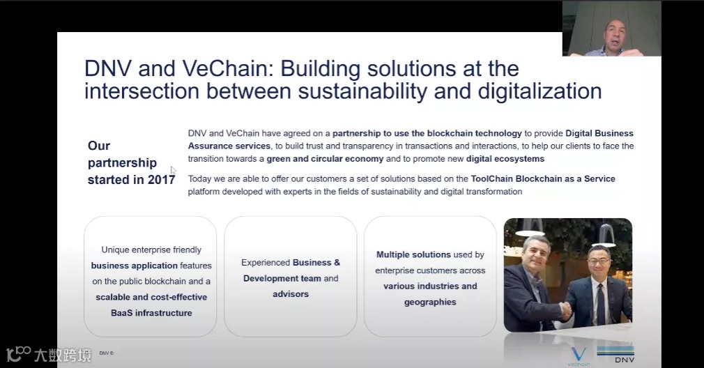 自 2017 年以来,DNV 与一位长期合作伙伴一起踏上区块链旅程。我们与唯链科技(VeChain)密切合作,共同构建解决方案。正是在可持续和数字化的交叉点上。我们正在创造巨大价值并被整合到许多解决方案中。这些解决方案是我们一直在整合过去几年中获得的知识和经验,可以通过其他各类服务传递给我们的客户。