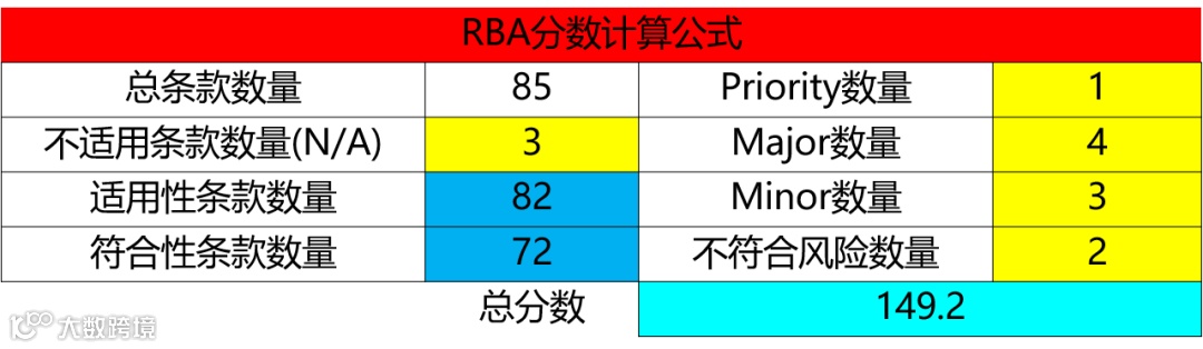 得分=200*(符合的条款书+不适用的条款数+不符合风险项数)/(85-不在审核范围的条款数)-20*优先不符合数-4*严重不符合数-1*轻微不符合数