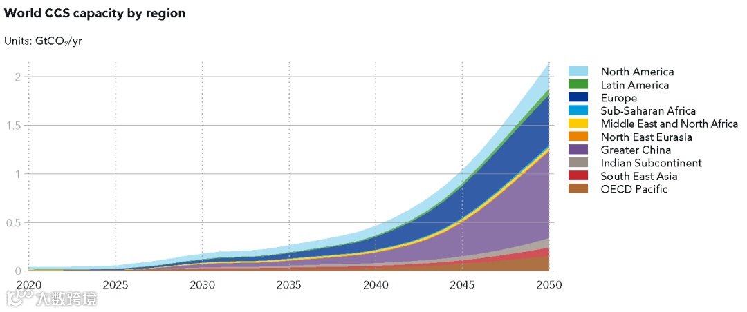 CCUS在2040年之前不会达到显著水平,预测2050年约可达到22亿吨CO2/年。尽管在该时间节点上CCUS得到了大规模尺度上的应用,但还不足以实现《巴黎协定》规定的目标。
