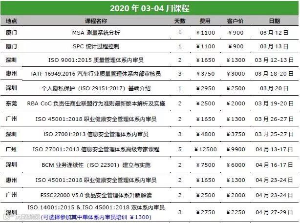以下是我们大中国南区2020年1月-4月的培训课程计划,如有需要,敬请与我们联系。