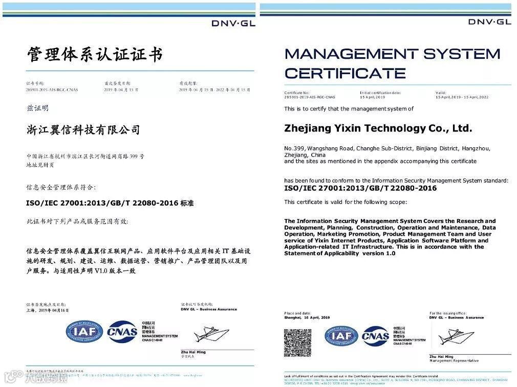 浙江翼信科技有限公司ISO 27001证书中英文版