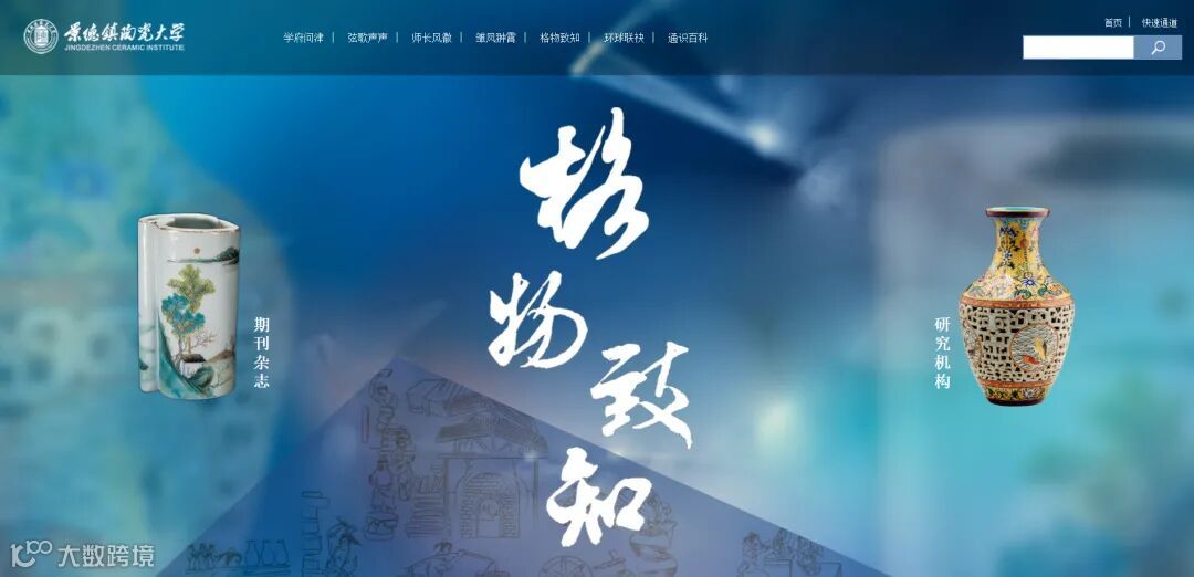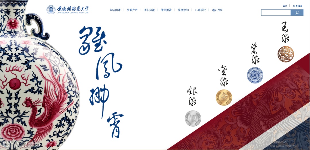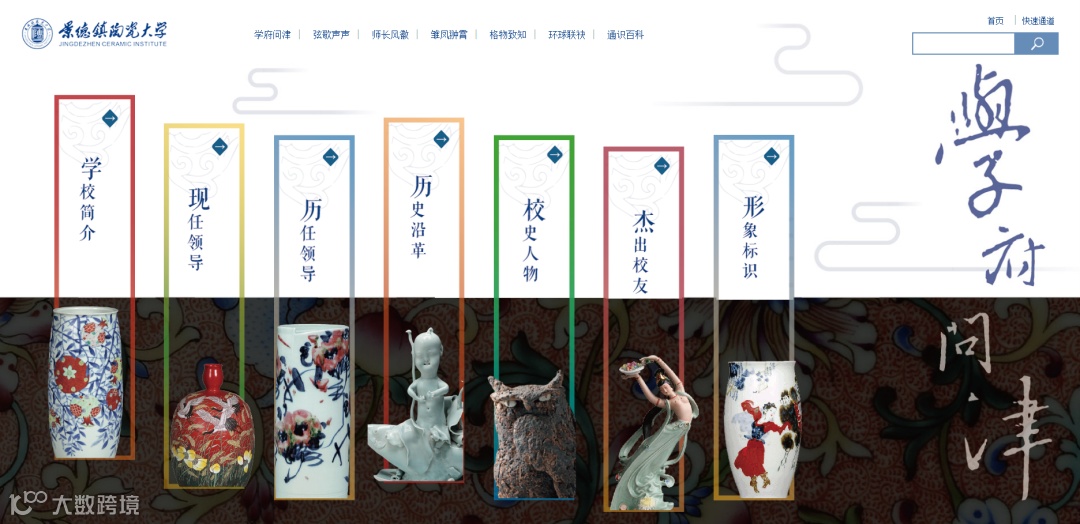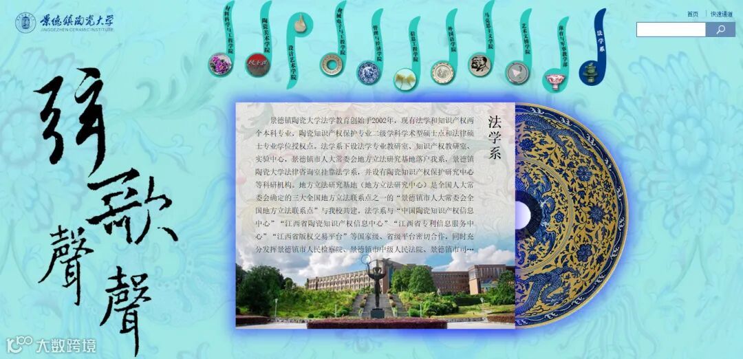 打破网站传统设计思维,栏目、版块页面根据内涵独立设计,以影青色为基调,充分融入陶瓷实物图案,采用名家书法字体,体现了学术、人文、美感的有机融合,彰显了学校深厚的文化底蕴和鲜明的办学特色。