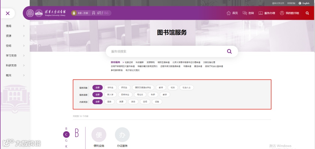 服务办理中,以读者身份、服务场景、内容类别等维度精准定位服务,同时针对服务提供独立搜索,直击读者需求;