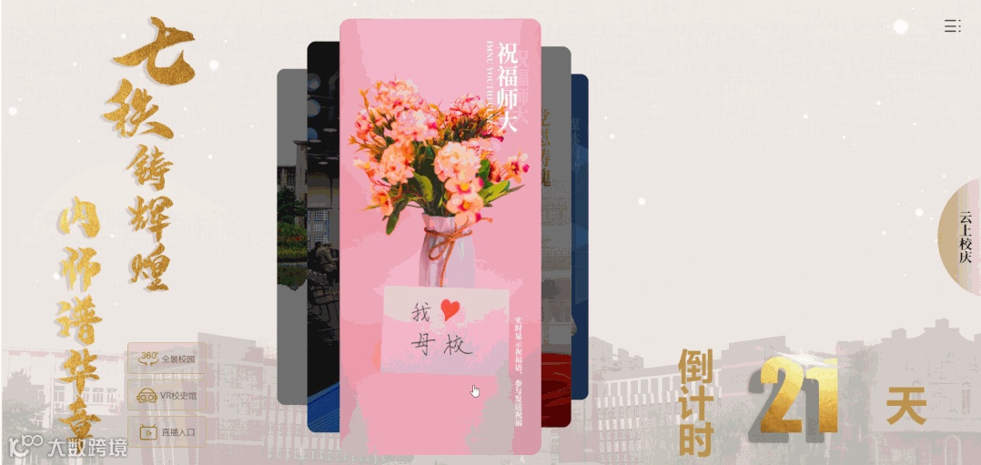 首页在定位学校身份的同时,突出“七秩铸辉煌 內师谱华章”校庆主题 ”,在旋转的书页上合理规划校庆内容安排,越来越近的倒计时,在传达时间信息的同时,赋予校庆隆重的仪式感 。