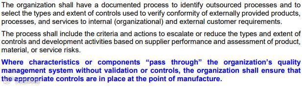 增加了对“传递特性”(pass through characteristic - PTC)的管理。简单来说,如果你的产品中有些由供应商产出的特性或部件,你什么都不管(没有确认或控制),就从供应商手里穿过(pass through)你公司(你的QMS)交付给客户,你必须在特性或部件的制造点(供应商)实施适当的控制。