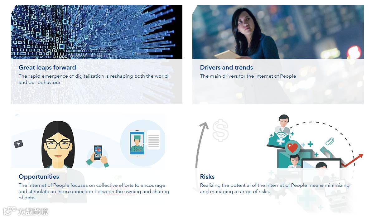“人联网”系指人与个人数据的收集、加工和应用之间的数字化关系。它构成了汇集智能的网络,并通过数字化服务、互联网和数据分享推动我们与数字之间的互动沟通。在医疗中,这种互联互通和数字自我的分享无论对个人、群体还是整个人口来说,都将改善并实现更个性化、更具预测性、共享性和预防性的保健。