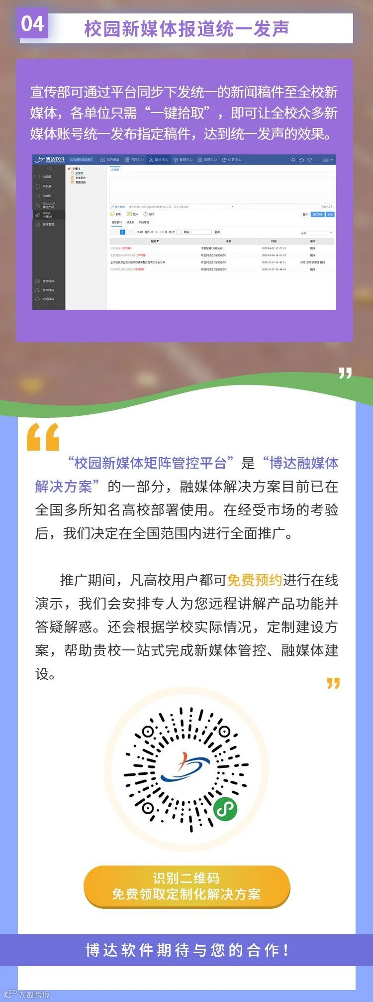 西安博达软件股份有限公司,是陕西省內首批次“双软”认证企业,作为5G时代全媒体数字内容智能服务专家,业务涉及内容管理、大数据、移动互联、云计算、人工智能、Web安全服务等领域。