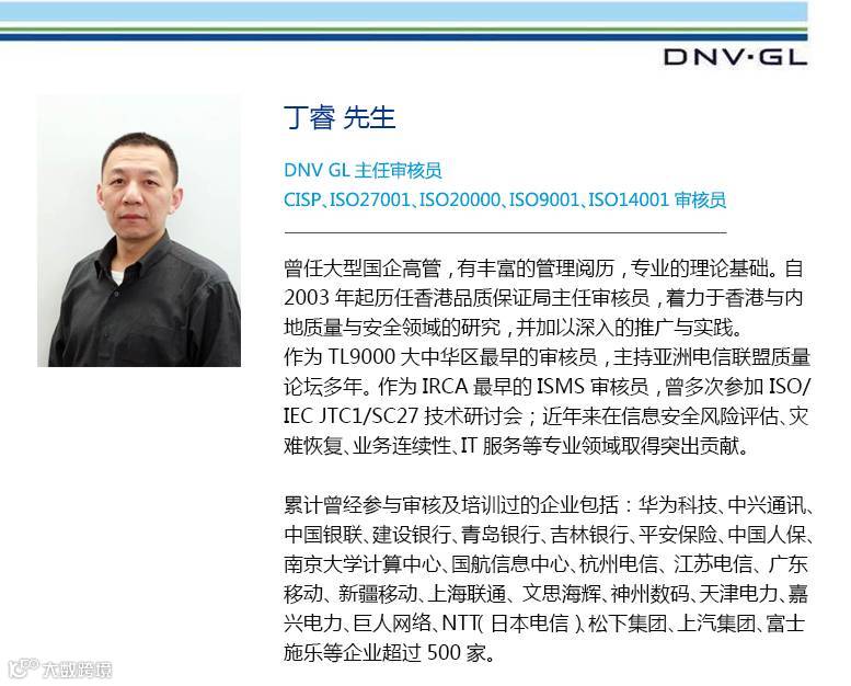 该课程的DNV GL讲师们都是经验丰富的ICT审核员。在课程中,讲师将与学员们分享他们对信息安全管理体系理论的理解和基于不同环境中的实际案例。课程还将联系学员实际工作经历,帮助学员理解、辨析基本信息安全管理体系知识,通过学员间的沟通、讨论,帮助学员分享工作经验并互相学习交流,使大家能充分理解基于国际标准的ISO/IEC 27001:2013的基本要求,并掌握体系审核所需的基本技巧。