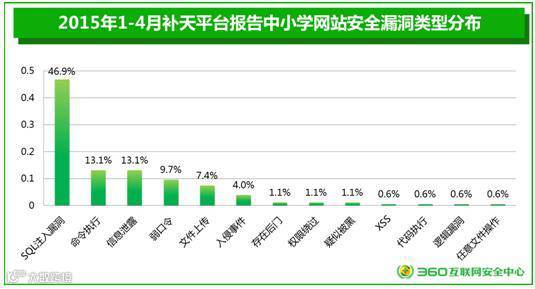 《2015年青少年上网安全分析报告》出具了来自360补天平台的数据,数据显示,1-4月,中小学校网站漏洞达到了175个。经补天平台安全专家确认评级,其中高危漏洞139个,占79.4%。