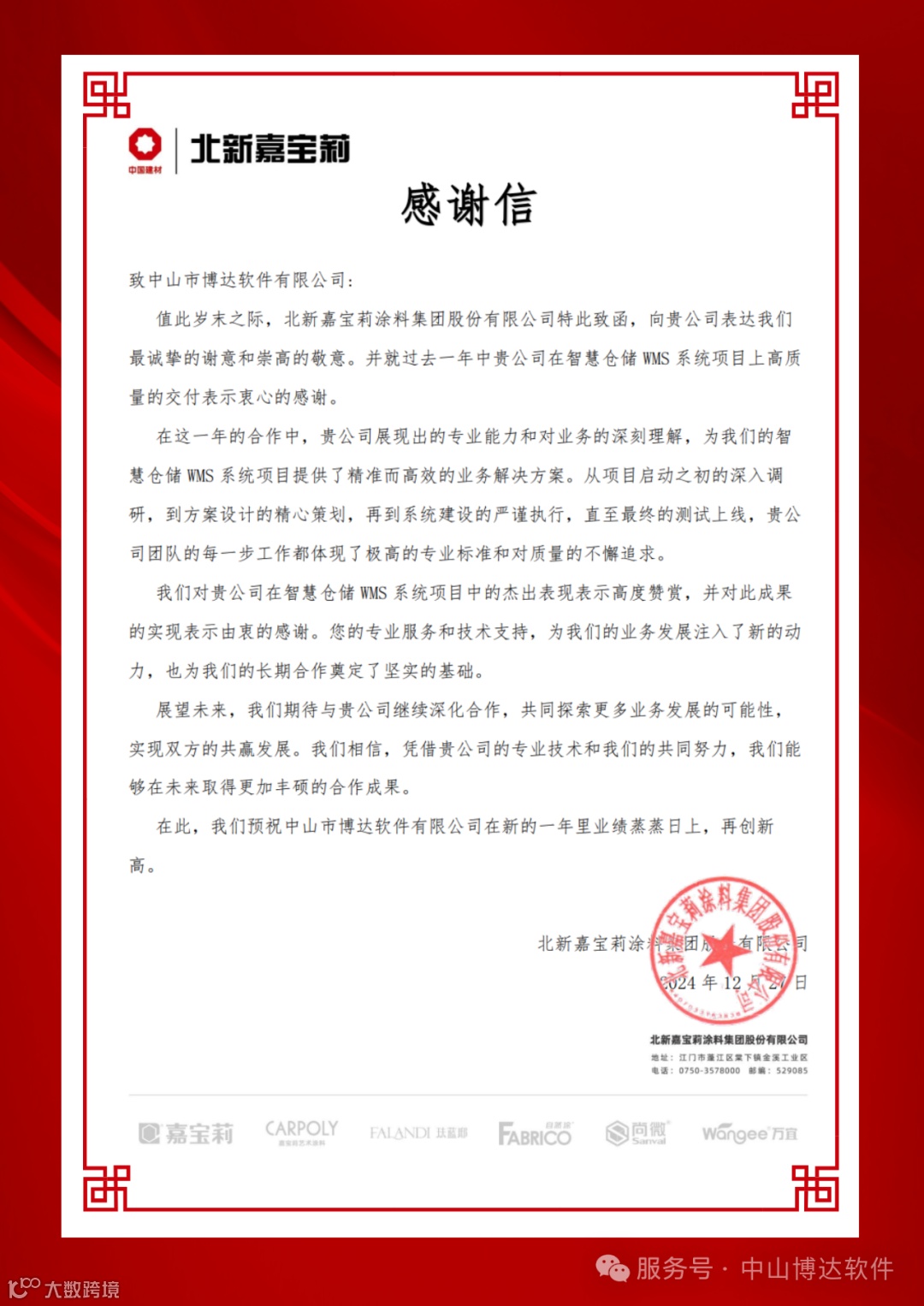 在商业往来的长河中,总有一些瞬间,如熠熠星辰,照亮我们前行的道路。近日,中山市博达软件有限公司收到了一封来自央企客户--北新嘉宝莉涂料集团股份有限公司的感谢信,来自客户的认可,是我们最大的前进动力。