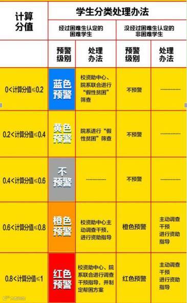这套系统是通过学生在校食堂、超市等消费情况,分析其消费水平,若计算分值在0.6左右,则属于“橙色预警”,学校资助中心会进行主动调查干预。