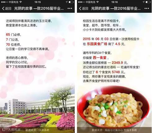 在国内,越来越多的高校也开始利用大数据来提供多样化的个性服务。通过学校数据中心分析学生的各类信息,如考试成绩、图书借阅数目和种类、一卡通消费额度等信息,综合性的分析判断学生的状态。根据分析结果,可以提供基于数据分析的奖助学金发放管理方案、因材施教的教学模式,同时更能为毕业生们在离校之际以清单形式存储情感记忆。