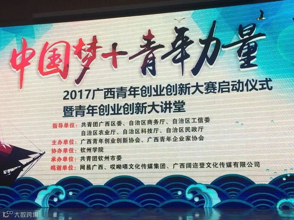 2017年6月23日,由广西青年创业创新协会、广西青年企业家协会主办的“中国 梦+青年力量”2017广西青年创业创新大赛启动仪式暨青年创业创新大讲堂在美丽的广西钦州学院正式举行。共青团广西区委副书记刘玄启,广西钦州市委常委、政法委书记林庆山,钦州学院党委副书记陈锦山,自治区工信委、农业厅、商务厅、科技厅领导代表等嘉宾出席启动仪式。本次启动仪式吸引了包括电子商务、互联网、农业企业、优秀创业青年、大学生等社会各界青年代表700多人参加。