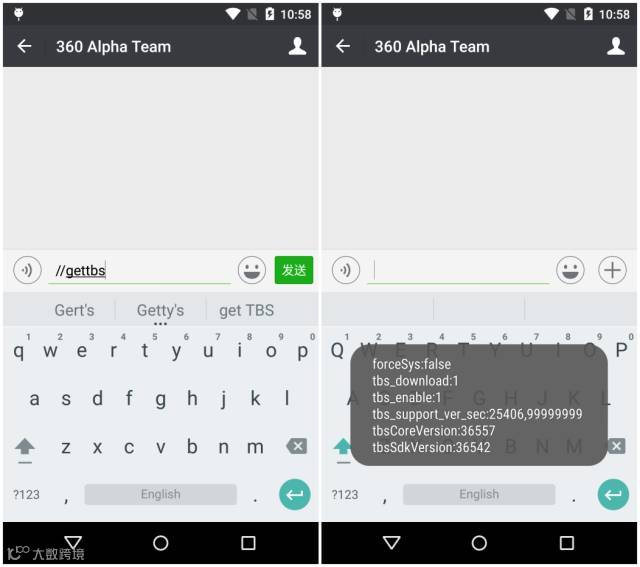 用户可在任意聊天对话框中输入“//gettbs”判定是否已经收到此漏洞补丁更新。如果tbsCoreVersion大于036555则说明该漏洞已经修复,否则微信仍存该漏洞。