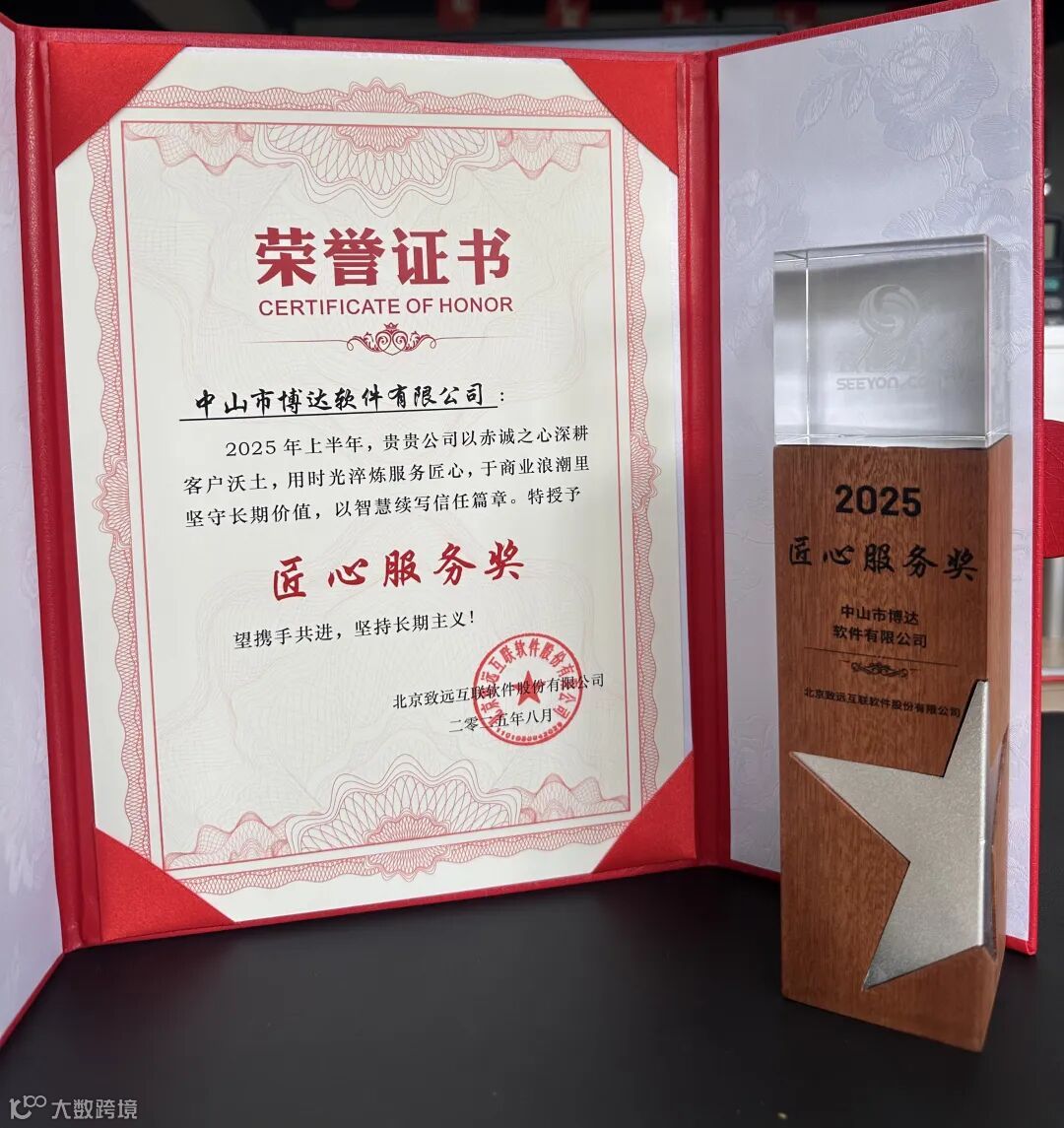 8 月 7 日,致远总部以“AI + 共创的力量” 为主题的全国精英伙伴大会在武汉盛大召开。在这场聚焦创新突破与服务升级的行业盛典上,中山市博达软件有限公司凭借多年深耕积淀的专业服务实力,以及在 AI 时代的前瞻布局与积极实践,从众多优秀同行中脱颖而出,成功斩获由致远总部权威颁发的 “匠心服务奖” 殊荣,让中山企业服务的强劲力量在全国舞台上闪耀生辉。