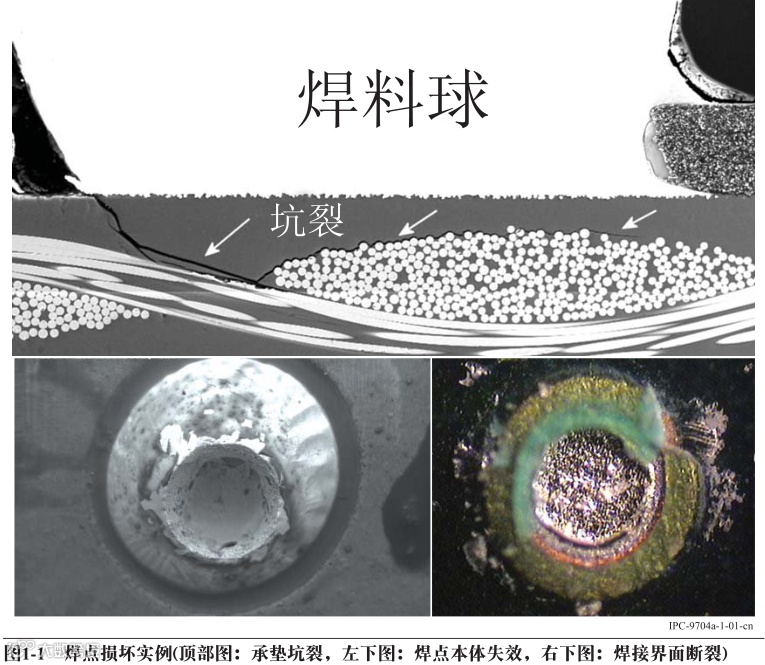针对不同的焊料合金、封装类型、表面处理或层压板材料,过大的应变都会导致各种模式的失效,包括焊料球开裂、线路损伤、层压板相关的焊盘翘起或承垫坑裂和封装基板开裂。