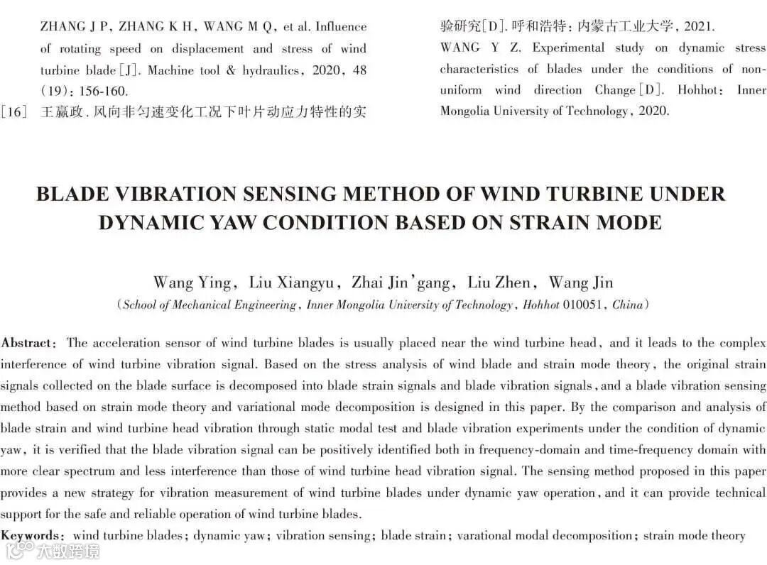 论文赏析‖基于应变模态的风力机动态偏航工况下叶片振动感知方法