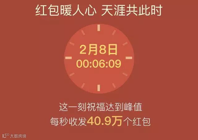 2、微信红包收发峰值出现在年初一00:06:09,每秒收发40.9万个红包。