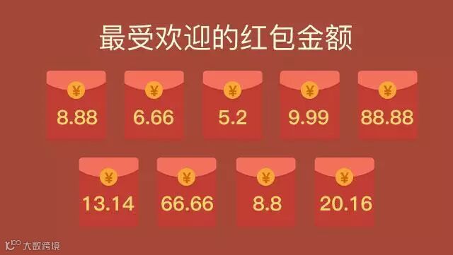 7、最受欢迎的红包金额依次是8.88;6.66;5.2;9.99;88.88;13.14;66.66;8.8;20.16。