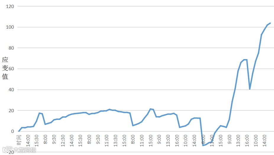 在拆除的全过程中,立柱最大应变为50με左右,横梁的最大应变为100με左右,施工结束之后,立柱的应变恢复到30με附近,横梁最大应变位置为100με。通过整套测试系统的部署与使用,确保了拆除工程的安全实施。