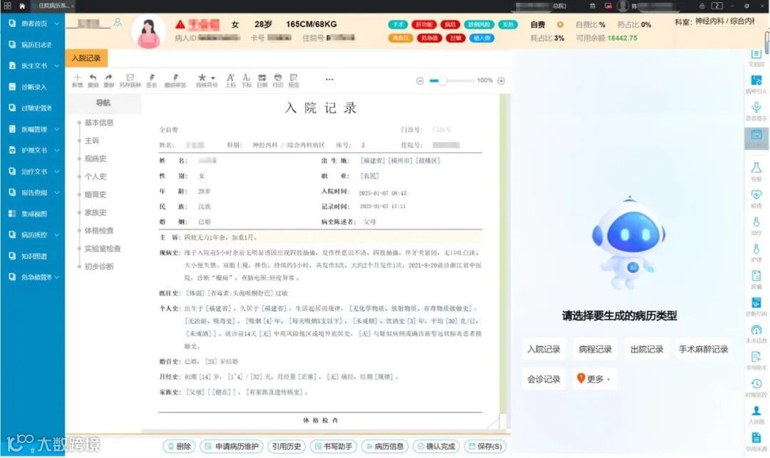 深度融入DeepSeek的AI能力,进一步增强病历书写效率与治理。基于智业病历书写引擎,持续学习优秀病历数据并做数据的提取及标记,实现更多智能化应用功能,如关键信息智能提取,自动从患者的电子病历中提取关键信息,精准生成病历内容;逻辑冲突检测AI增强算法,精准识别病历中的潜在错误和不规范之处,提示医护人员进行修改,生成结构清晰、逻辑严谨的病历内容,提高病历质量和规范性;个性化模板AI定制,实现根据不同的科室和病种,精准快速地生成病历文书。