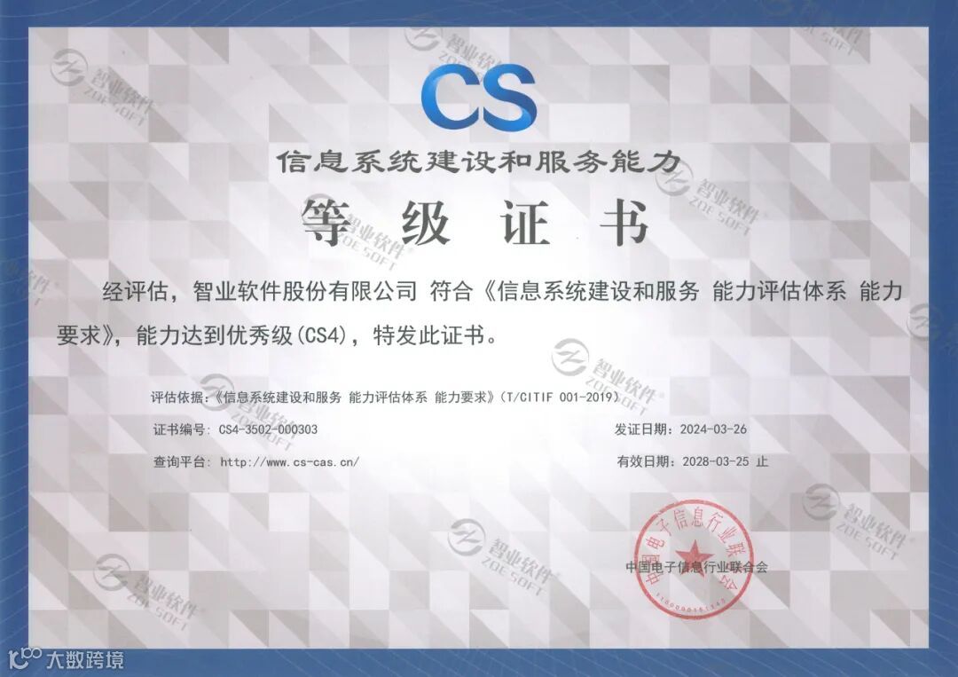 近日,智业软件通过中国电子信息行业联合会综合评估,获得“信息系统建设和服务能力优秀级(CS4)”认证,这是当前CS体系标准在国内开放可评的最高等级,标志着公司的战略、经营、人才、技术、管理和创新等综合能力均已达到优秀水平。