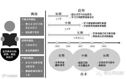 高等教育机构未来五年的前景如何?哪些技术和发展趋势将推动教育变革?哪些是可以解决的或难以克服的挑战?如何制定有效的战略解决方案?这些关于技术运用和教育变革的问题引发全球专家的协同研究和讨论,并在新媒体联盟(NMC)与美国高校教育信息化协会(EDUCAUSELearning Initiative,ELI)的合作支持下,来自17个国家的56名专家将研究成果汇集成《2015地平线报告高等教育版》。该报告旨在考察新兴技术对高等教育教与学及创造性探究所产生的潜在影响。预测了2015年至2019年加速高等教育技术采用的关键趋势、阻碍高等教育技术采用的重要挑战以及高等教育中教育技术应用的重要进展。
