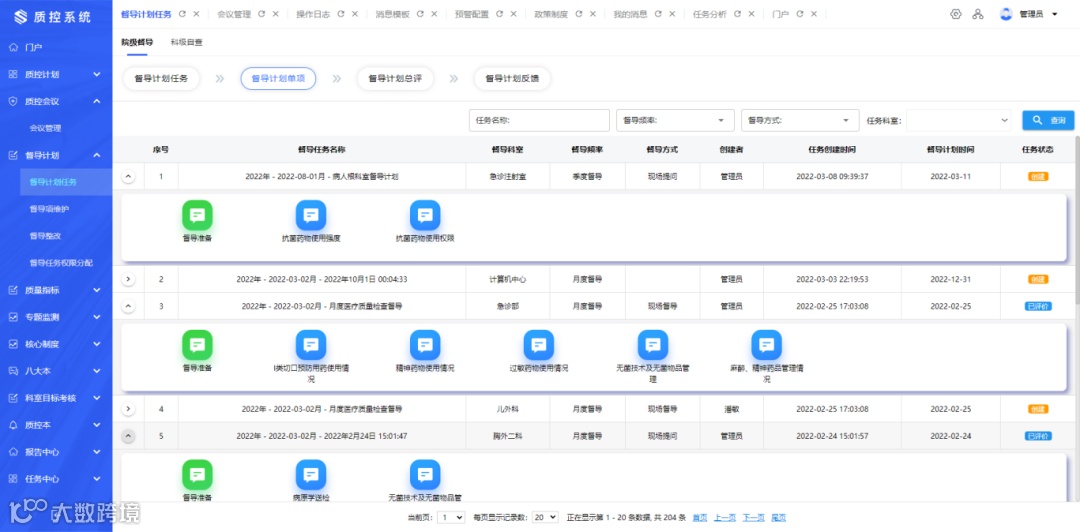 智业医疗质量安全监管系统通过质控计划、质控会议、督导计划、质控本、质量报告管理等模块,支持针对不同层级委员会制定质控计划,记录质控会议纪要并根据各科室监管内容及关注指标内容自动生成质控本,督导检查医疗质量日常工作并提供线上检查表单灵活配置,实现全流程无纸化管理,降本增效,助力医院医疗质量日常监管工作高效便捷智能化。