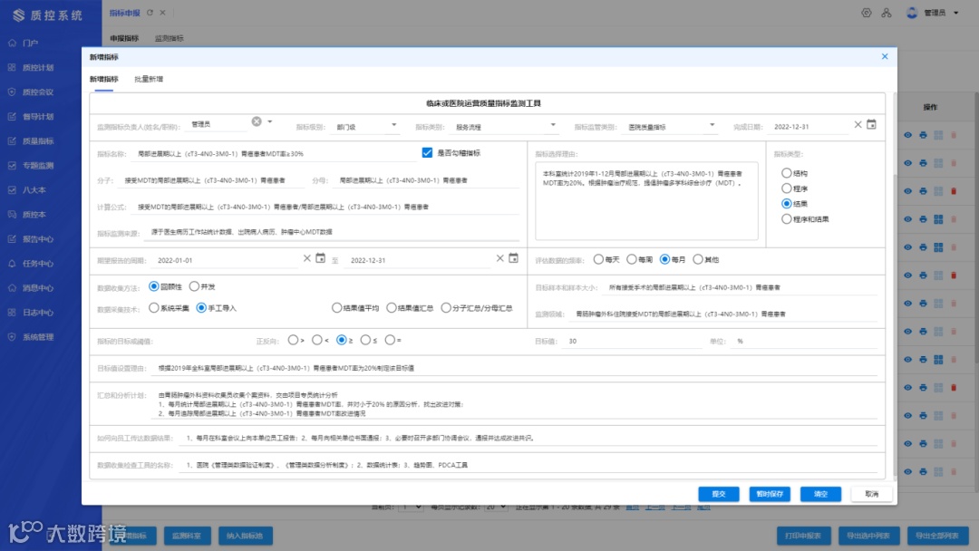 智业医疗质量安全监管系统通过统一规范的“临床/医院运营质量监测指标工具”落实国家标准要求监测指标、医院管理层关注的核心指标和各级行政部门要求监测的关键质控指标,全面收集指标数据信息,规范管理监测指标,数据采集方式多样化,降低指标收集工作量,有效提高医疗质量指标监测效率。