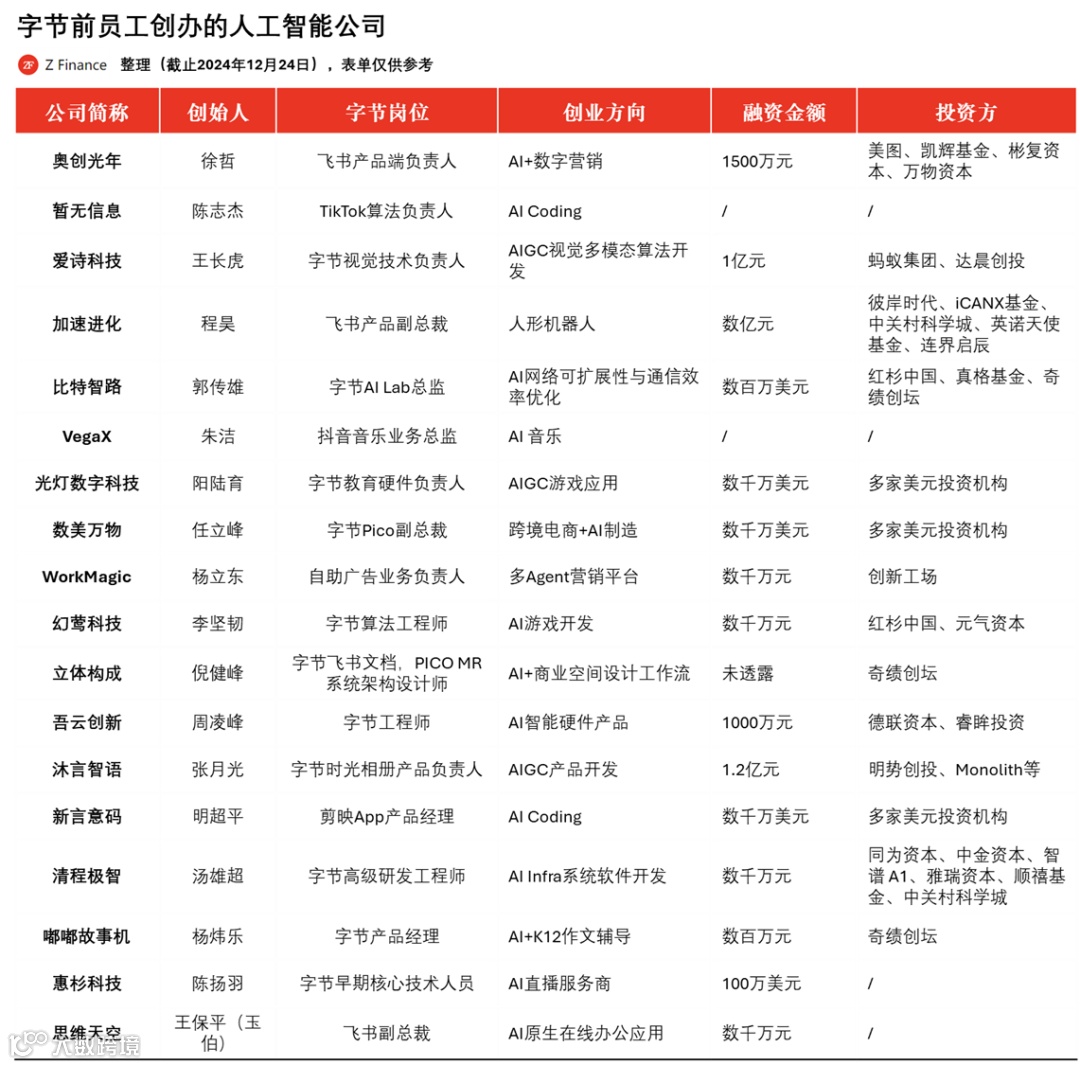 根据 Z Finance 的不完全统计,已有 18 位字节跳动前员工投身 AI 领域开展创业。