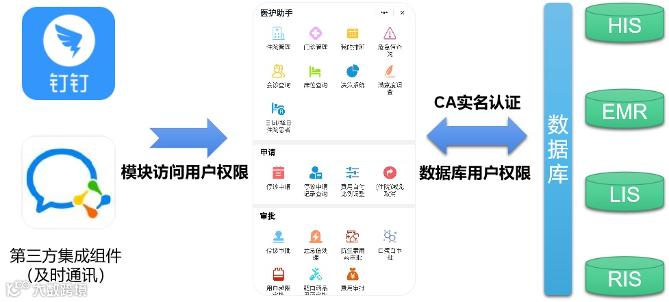 掌上医护支持通过CA身份认证,根据用户角色权限展示相应的功能模块图标(移动端同步医生在HIS、EMR、LIS、RIS等系统中的用户角色权限,获取医生可使用的功能模块和数据范围),既保证数据记录不泄露,又针对不同岗位角色进行了个性化展示。同时,掌上医护支持与多种第三方组件集成,可在钉钉或企业微信中使用掌上医护。