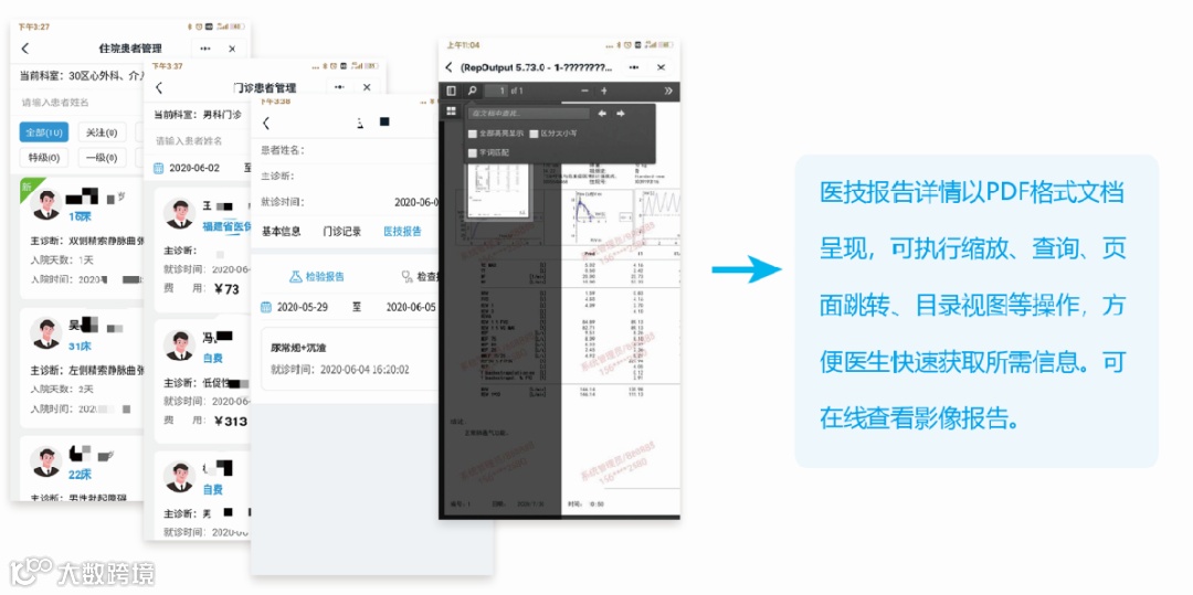 通过掌上医护,可随时随地获取患者信息,可查询指定时间范围内的患者基本信息,患者病历、临时医嘱、长期医嘱、处方信息、历史诊断、历史检查/检验报告等。支持门诊/住院患者信息查询、择日入院患者以及日间手术患者信息查询。