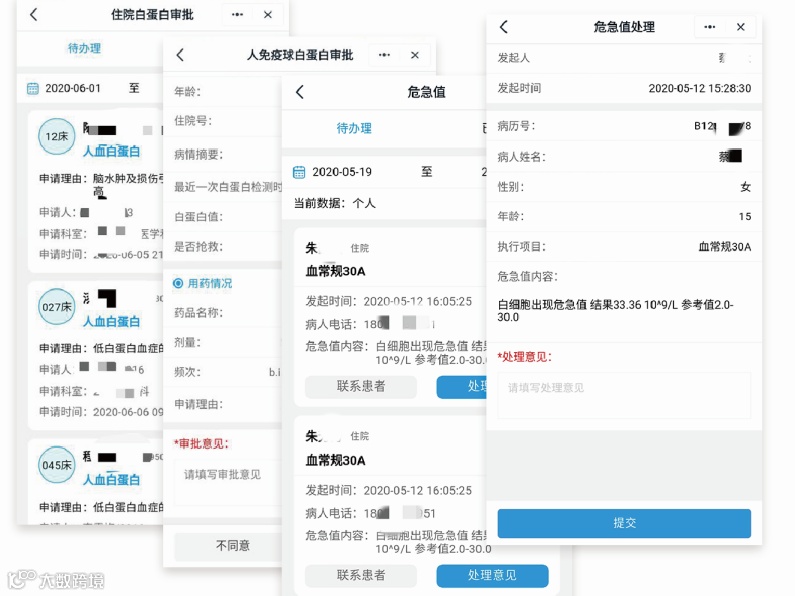 掌上医护与业务系统对接,实现移动审批,可随时随地高效办公,及时执行危急值处理、用血超限审批、抗生素用药审批、靶向药品用药审批、人免疫球白蛋白用药审批、费用比例自付调整、住院减免取消、医保费用审批以及病种精准扶贫审批等。利用医务工作者碎片化的时间处理审批事务,高效便捷。