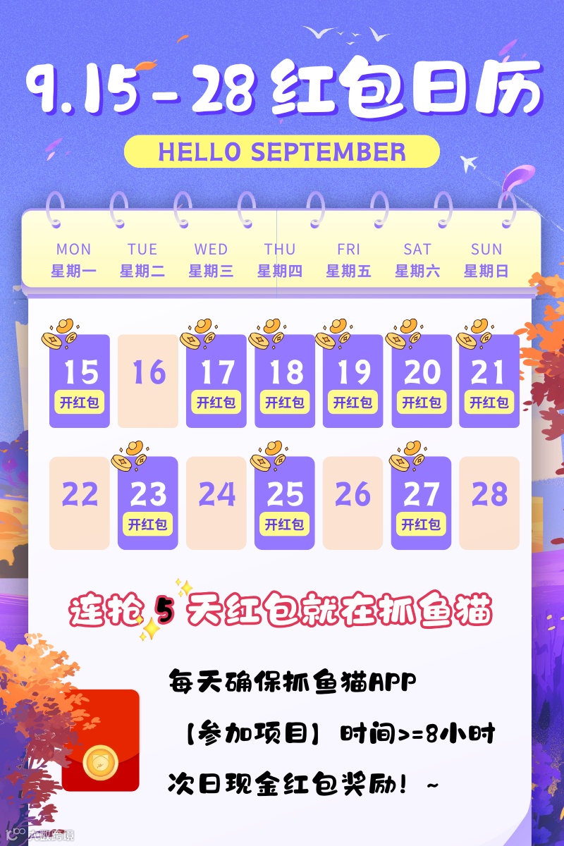✅ 活动日打开抓鱼猫APP,开启现金红包