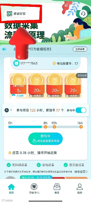 被邀好友成功注册抓鱼猫后,日活跃(今日参与项目小时)超过8小时,邀请人将获得1积分奖励(抓鱼猫APP内“今日参与项目小时”)。
