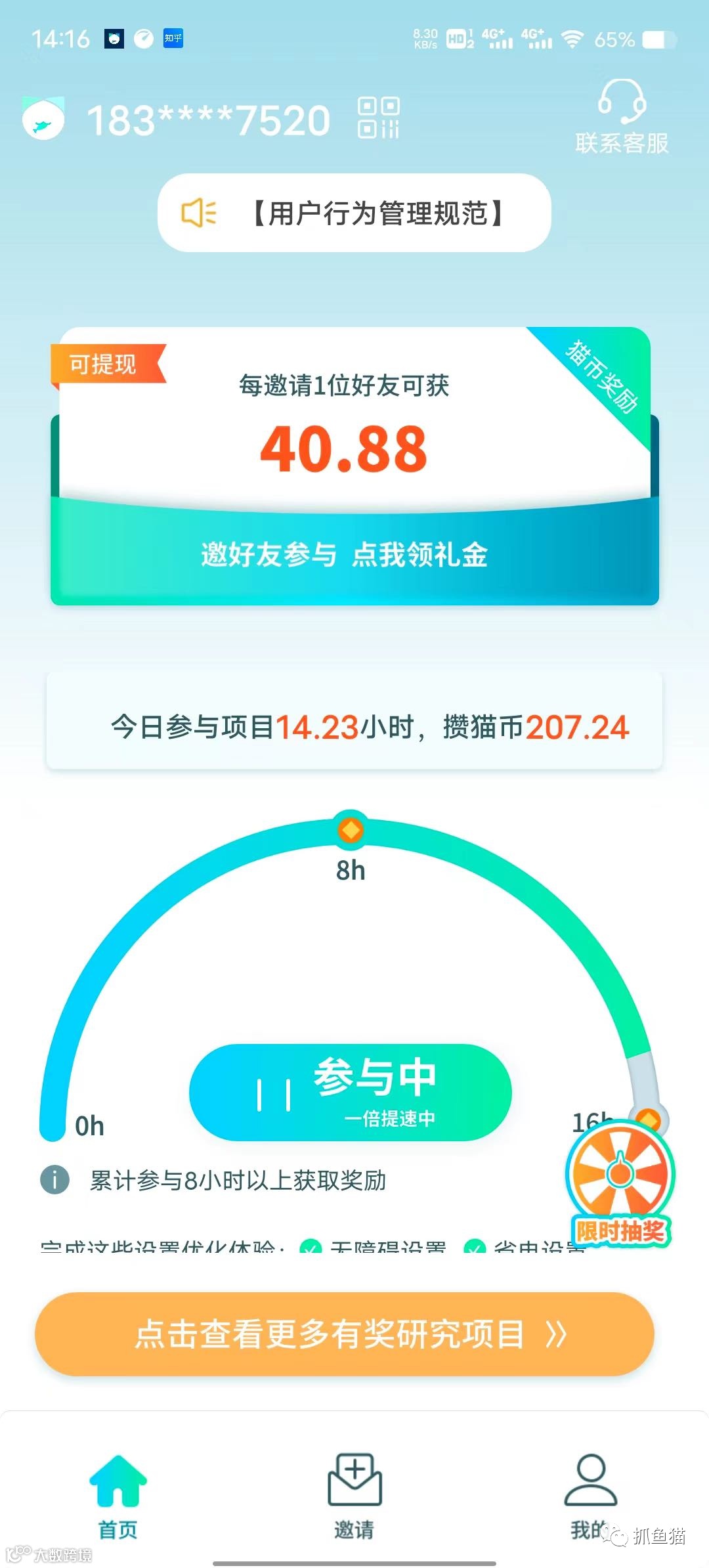我发现了一个超好用的可以获得零花钱来源的APP!是一个正规有偿调研APP!它就是抓鱼猫APP~使用起来真的真的非常简单!!只要进入主页点开参与项目按钮正常使用手机即可有收益!如果想获取更多收益的话,就去关注抓鱼猫公众号!抓鱼猫公众号上会发布很多抓鱼猫APP的获取奖励金活动哟~很多活动都是无奖励上限哒!我已经在抓鱼猫APP实现零花钱自由啦,现在分享给大家~一起来跟我加入抓鱼猫!