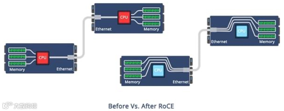RoCE技术支持硬件卸载,将网络数据处理任务从CPU转移到专门的网络适配器硬件上。