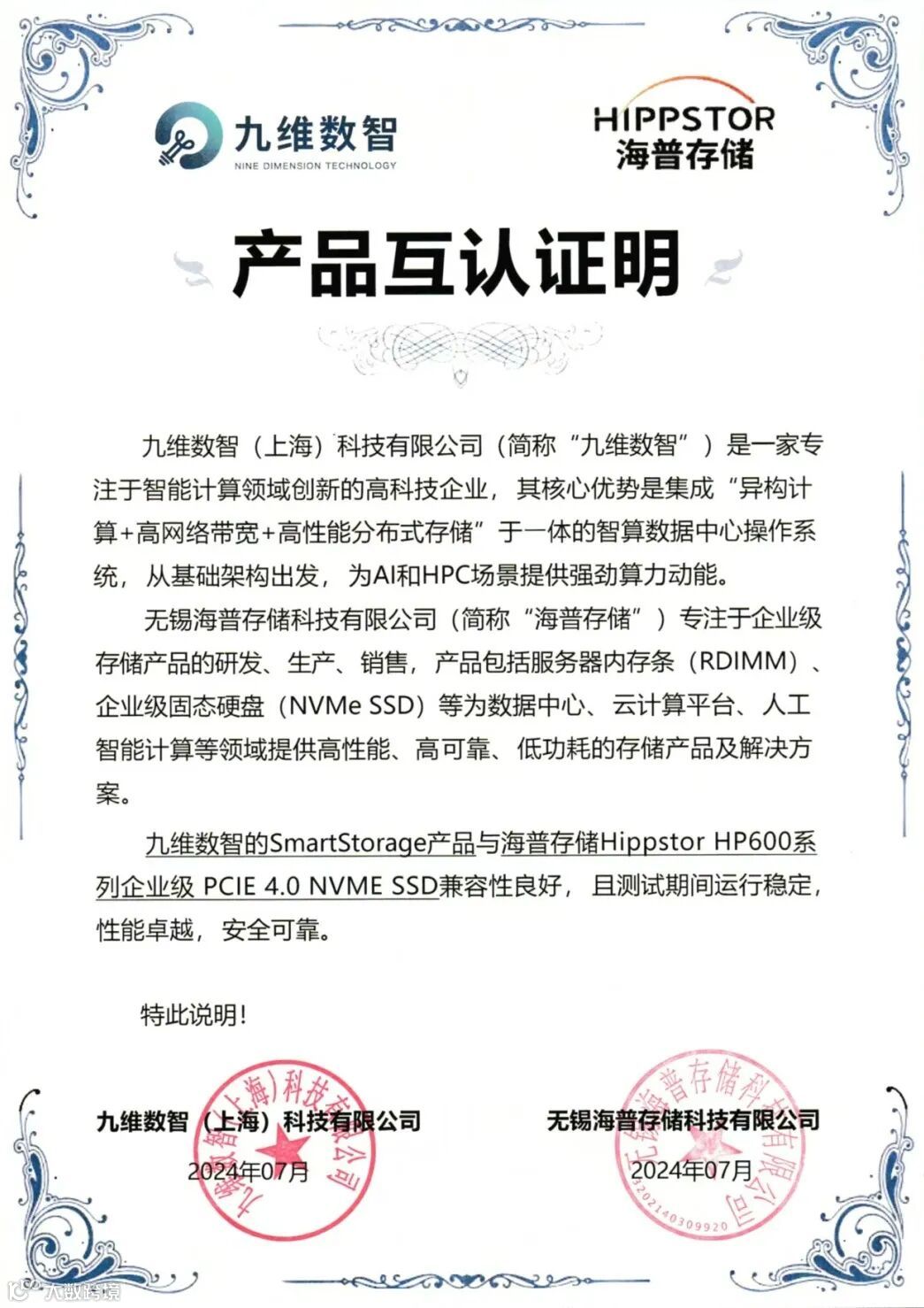 九维数智一直专注于智能计算领域的创新,致力于为 AI 和 HPC 场景提供强大的算力支持。而海普存储则在企业级存储产品领域深耕细作,为数据中心等领域提供高性能、高可靠的存储解决方案。此次双方产品的互认,是在国产创新产业生态建设中的重要一步。