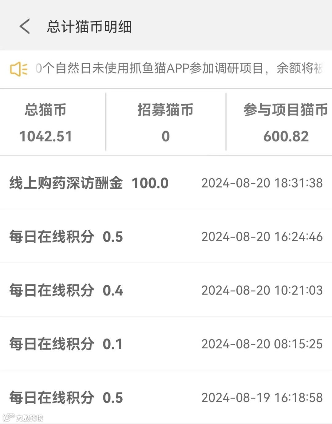 只要您坚持使用抓鱼猫APP,长期稳定【参加项目】,您就有机会参与定向调研活动,在日常调研酬金(月18-30猫币)之外,额外获得1~260猫币高额定向调研奖励。