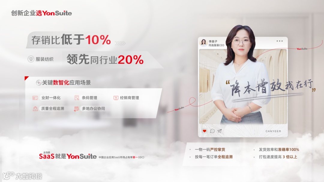 在传统服装行业,数智化转型也为其加速开启了效益的增长曲线。同昌服装借助YonSuite的强大功能,实现了库存管理的革命性突破。通过YonSuite搭建的云平台系统,同昌服装能够实时获取销售、代理商和电商平台的数据,及时调整生产计划,降低库销比至10%以下。这不仅提高了企业的现金流周转效率,还确保了用户体验的优化。同昌服装的生产经理也曾表示,YonSuite帮助他们实现了从订单到面料再到成衣送到仓库的快速流转,产品基本都在路上,大大提高了企业的周转效率。