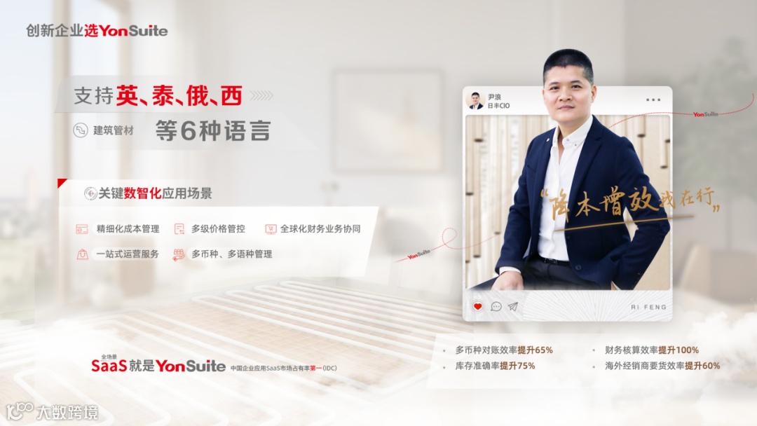 如今,已有千行百业的创新企业在YonSuite助力下,实现了显著的降本增效成果,成为各行业/领域的标杆。以日丰为例,通过引入YonSuite,成功实现了对海外业务的迅速支撑和快速IT部署。使得日丰能够在不同国家顺畅地使用系统,提高了业务的一致性和可控性。同时,通过YonSuite的数据分析功能,日丰能够更好地掌握销售业务的成本毛利情况,为后续的销售业务开展和优化提供了数据保障,YonSuite帮助日丰成功实现了财务核算、库存管理、海外经销商运营管理的效率提升。