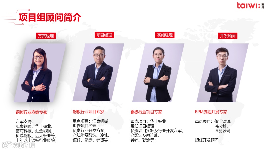 泰维公司对华惠科技项目也非常重视,顾问团队由多位资深的钢板行业顾问组成,全力支持华惠科技信息化项目的实施和开发,确保项目如期交付。