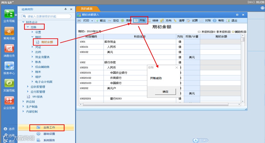 1.路径:业务工作—财务会计—总账—期初余额—开帐