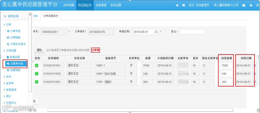 通过上了供应商管理平台,我们将采购计划从ERP下达自动生产采购订单,我们供应商在采购平台里面进行确认回复,所有的信息都是同步。并且还在系统里签订价格协议,自动进行对帐挂帐,然后开票,包括质量的追溯,所有都在系统自动完成。这里展示的订单回复的界面,这张表上可以看到哪个供应商的什么产品?下达的计划是多少,供应商回复的数量和能够送货日期,都可以清晰的展现出来。供应商可以随时查询相关的信息。