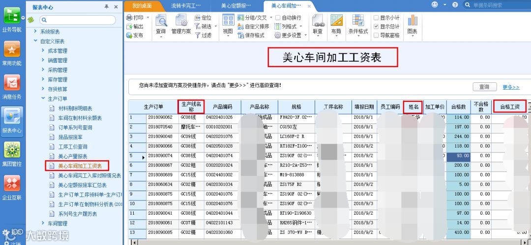 我们上线了这个计件工资系统,这个系统的主要原理,对每一个工序,每一个员工他做的每一件产品都用条码扫描,然后来进行报工,系统就会自动计算出员工的合格品产品报废数量和他的工资。这是我们的一张报工表,这个表里面可以看到,有流转卡的卡号,有生产订单的订单号,有产品的明晰,有下给员工的计划数量,就是这张流转卡你要做多少数量,有员工的编号和姓名,有产品对应的工资,所以说员工是可以随时查询他的产量和他的工资情况。