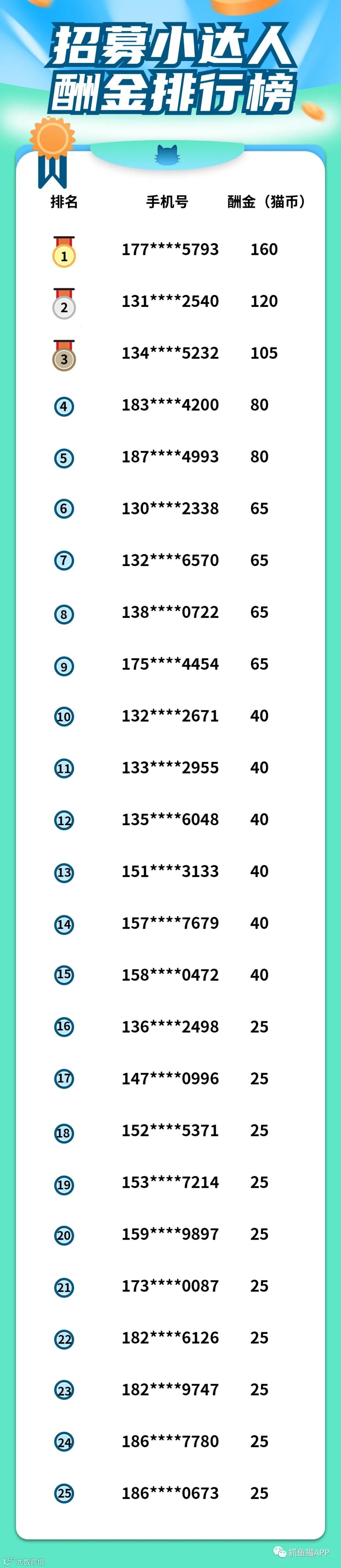 “招募小达人”活动第六轮结算酬金榜单来咯~截至目前已发放酬金奖励11020猫币!祝贺177****5793用户获得酬金160猫币,获得榜单第一名,131****2540用户获得酬金120猫币,获得榜单第二名~祝贺134****5232用户获得酬金105猫币,获得榜单第三名~你还不快快行动?奖金池已准备好,就等你来拿啦!