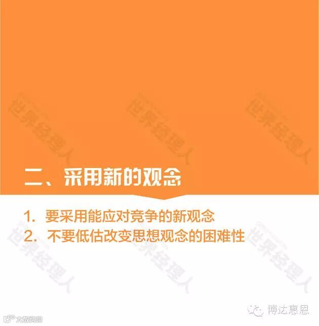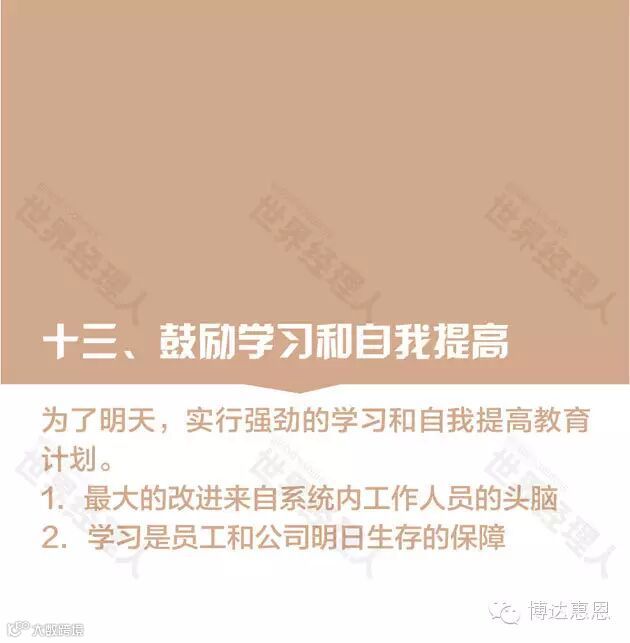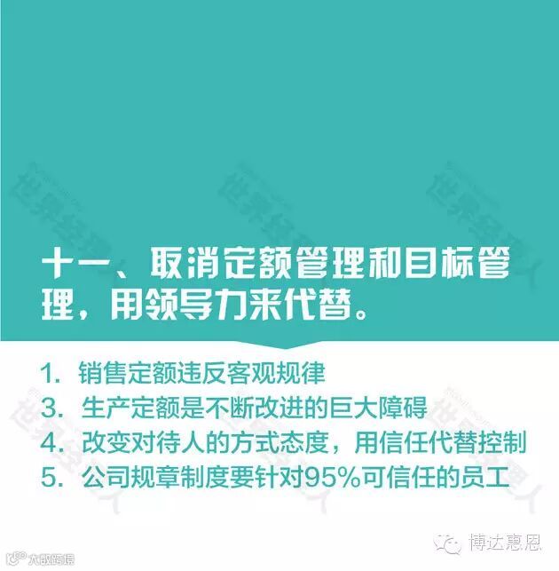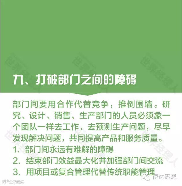 戴明为全球企业制订了14条转变管理的原则(The fourteen points for the transformation ofmanagement)可谓良药苦口,要求老板们首先要改变自己,甚至要改头换脑。