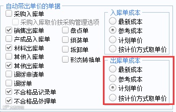 2) 销售出单,材料出库单,其他出库单,不合格品记录单,不合格品处理单,根据出库单成本中选择的方式带出价格;